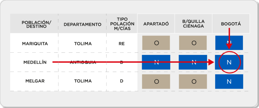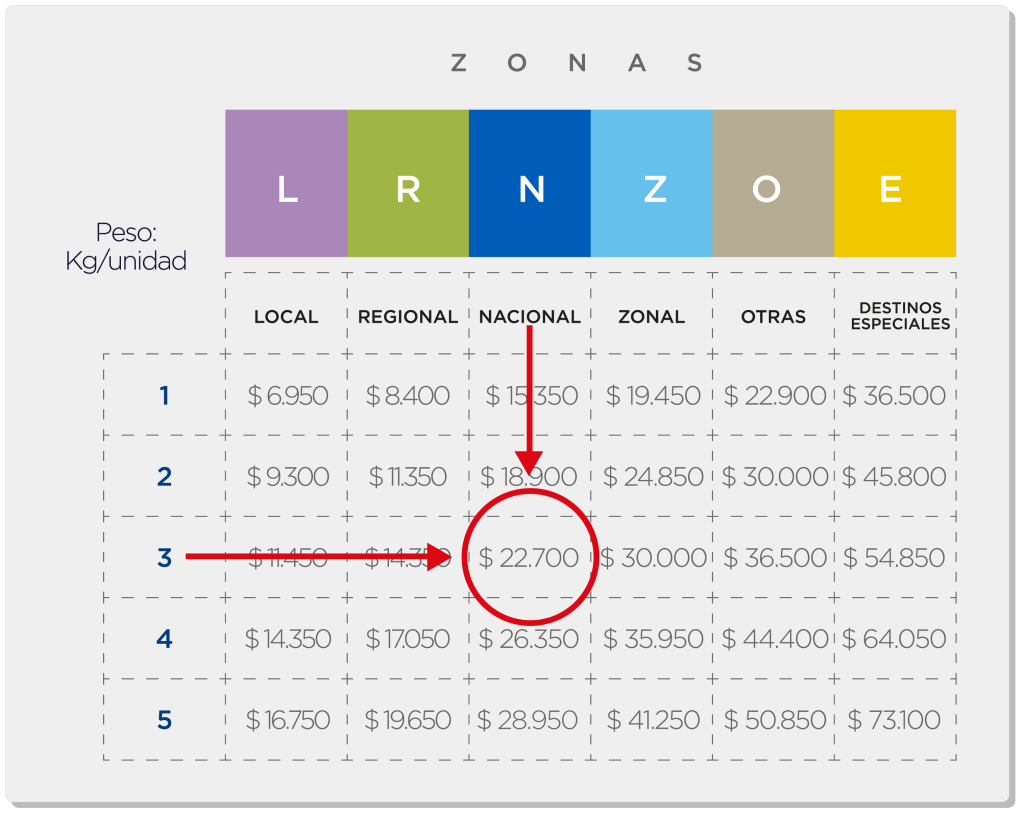 Paso 1: Identifica la zona de tu envío según el origen y el destino en la TABLA DE DOCUMENTOS Y PAQUETES. Esta está indicada con un color y una letra. (tabla ubicada al finalizar la página) Ver ejemplo: